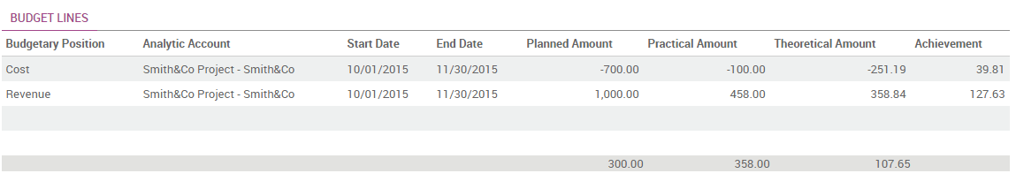We will use the following example to illustrate. We just started a project with Smith&Co and we would like to budget the incomes and expenses of that project. We plan to have a revenue of 1000 and we don’t want to spend more than 700.